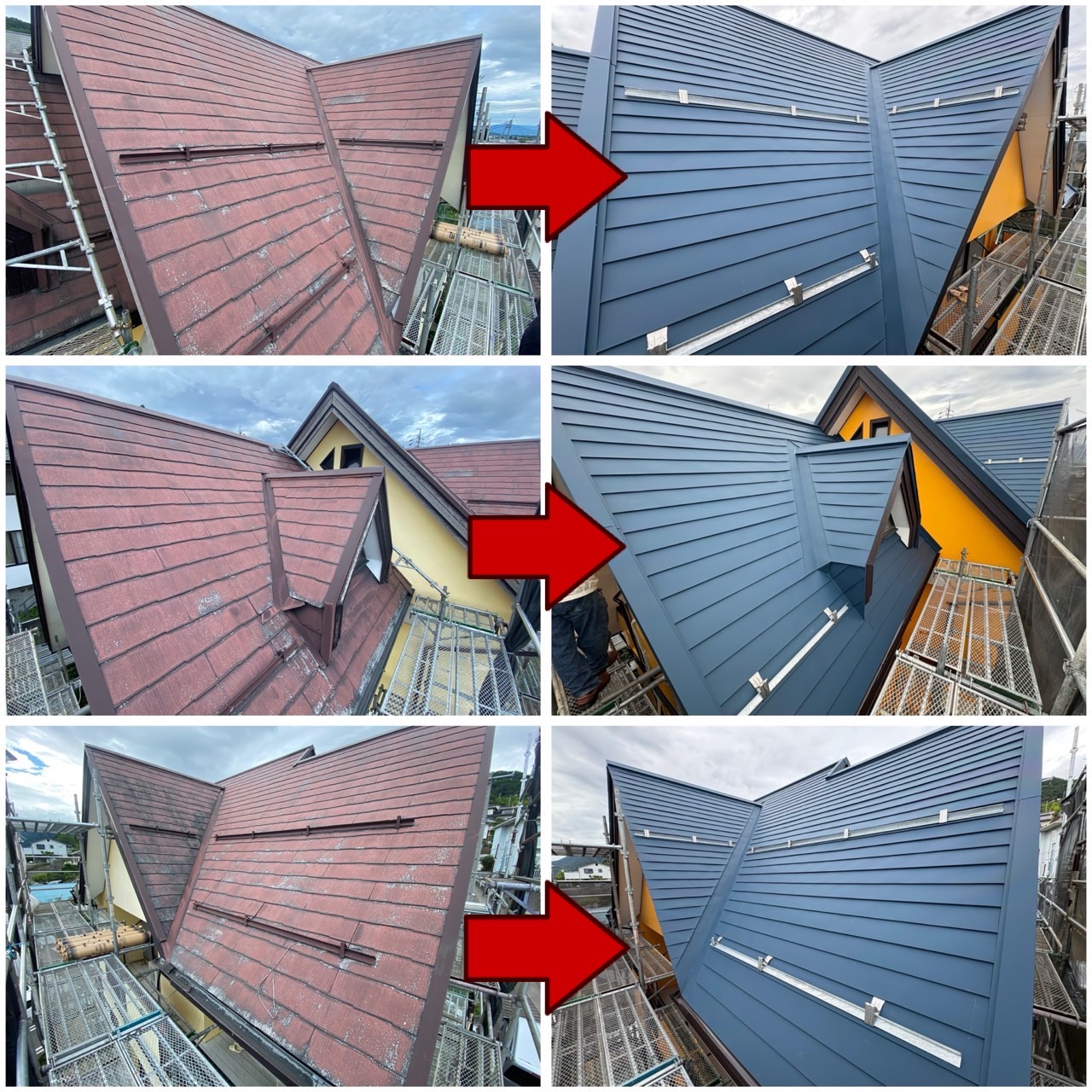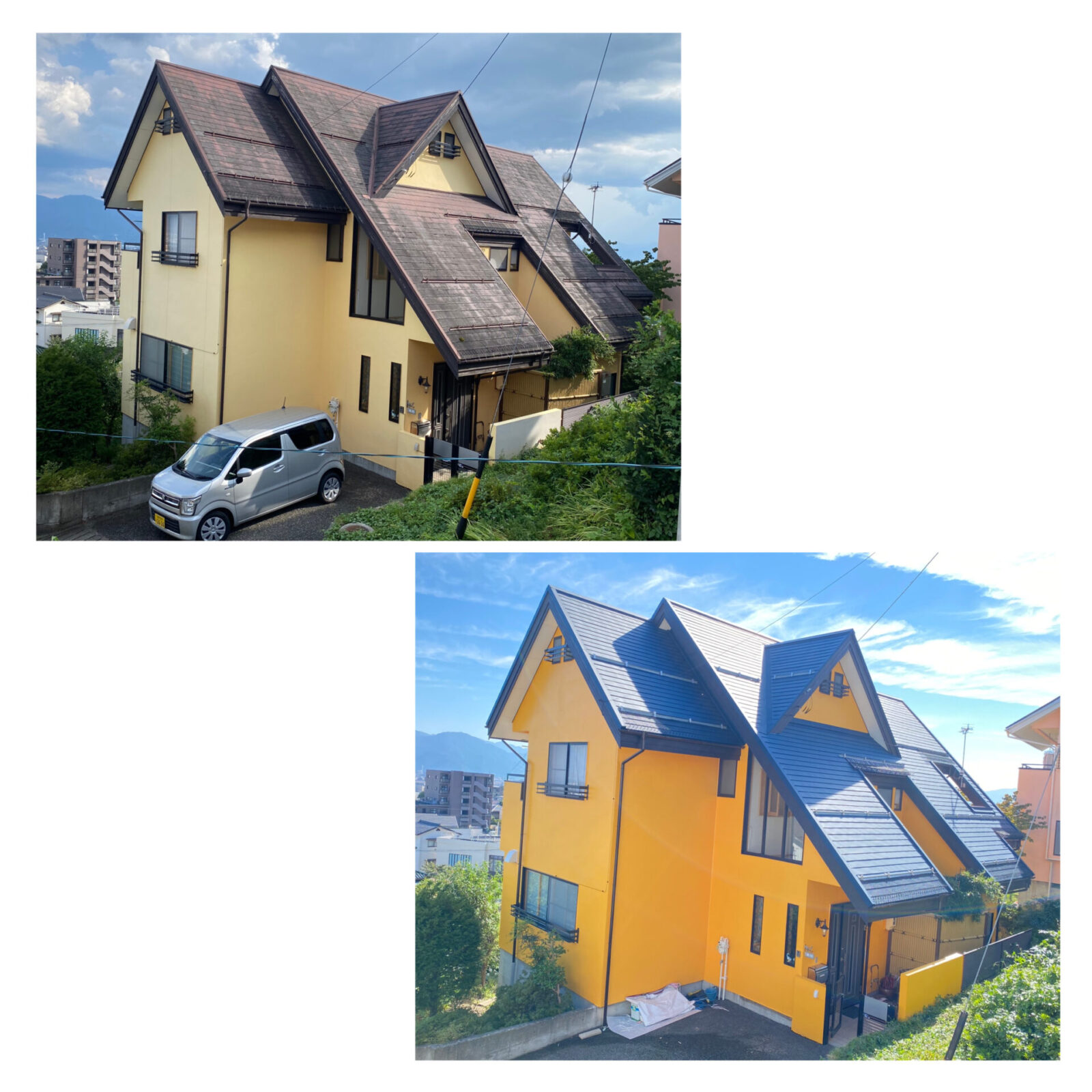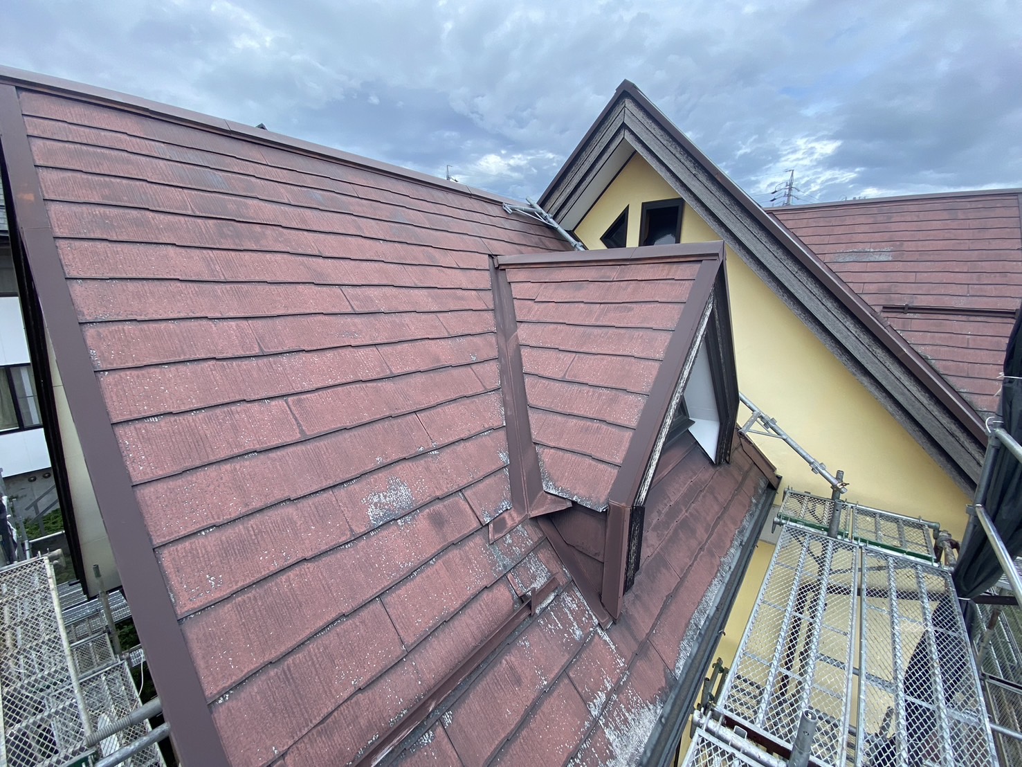 築年数20年以上のスレート屋根は早めの塗装をしていてもしっかりとした下地処理を行わずに塗装をすると3年後辺りからまた劣化進行が見られます。ボソボソになってしまった屋根材はもう塗装ではどうにもなりません。。塗装に比べて費用はかかりますが、カバー工法をしてしまえば20年以上は屋根での悩みは無くなります(๑>◡<๑)