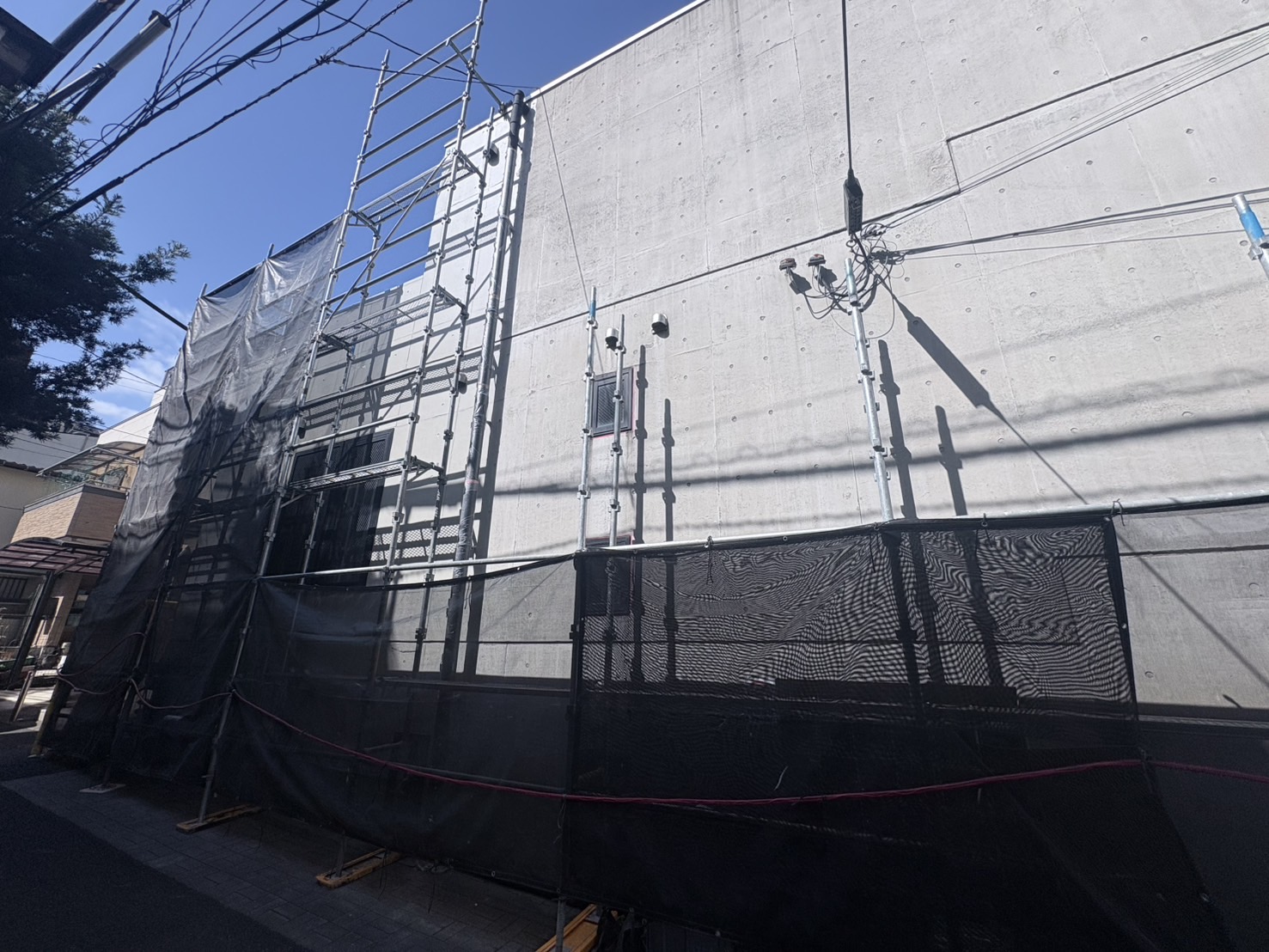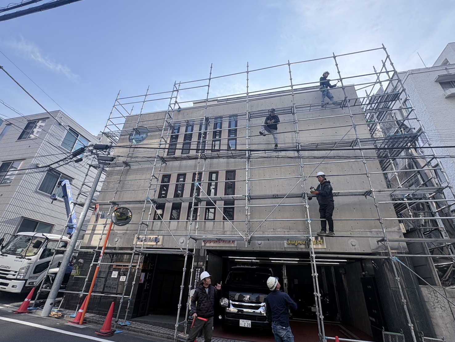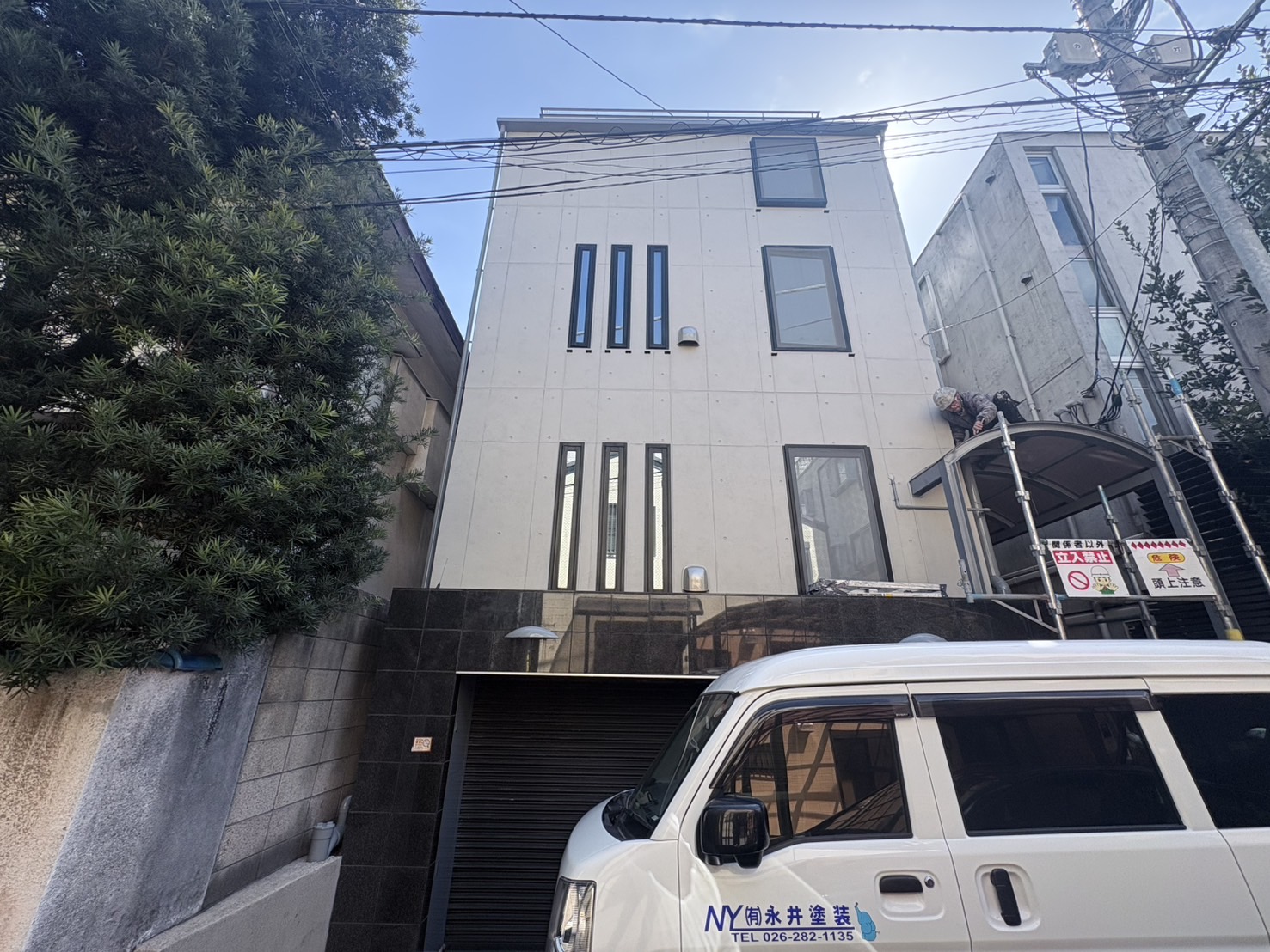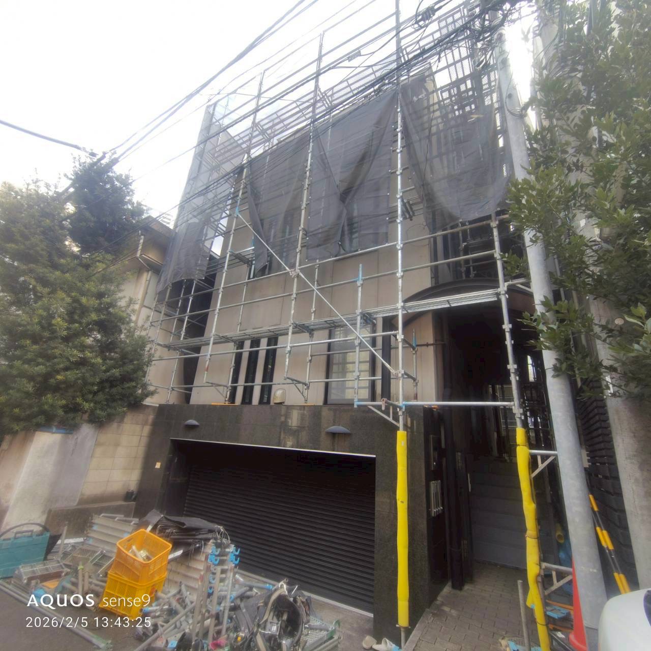 昨年施工させて頂きました、デジタル・ラボラトリー様の本社ビルと社員寮の塗装工事を2月施工させて頂いています(*^^*)道路幅や敷地が狭い為、仮設足場の組立作業が一気に出来ないので奥の寮から日を分けて順次に進めています。先日3/9に本社ビルの正面側とガレージ内側の仮設足場を組立ました。正面は高級車や通行人が飛び交う道路面の為、作業にも気配りが必須(>_<)専務自ら誘導員となり作業完了を見守りました!塗装は長野のデジラボ様と同様SA工法で仕上げます。奥の寮と本社ビルの奥はほぼ完成(^^)新築コンクリートの様に綺麗になりました✨全体の完成が楽しみですね(*≧∀≦*)