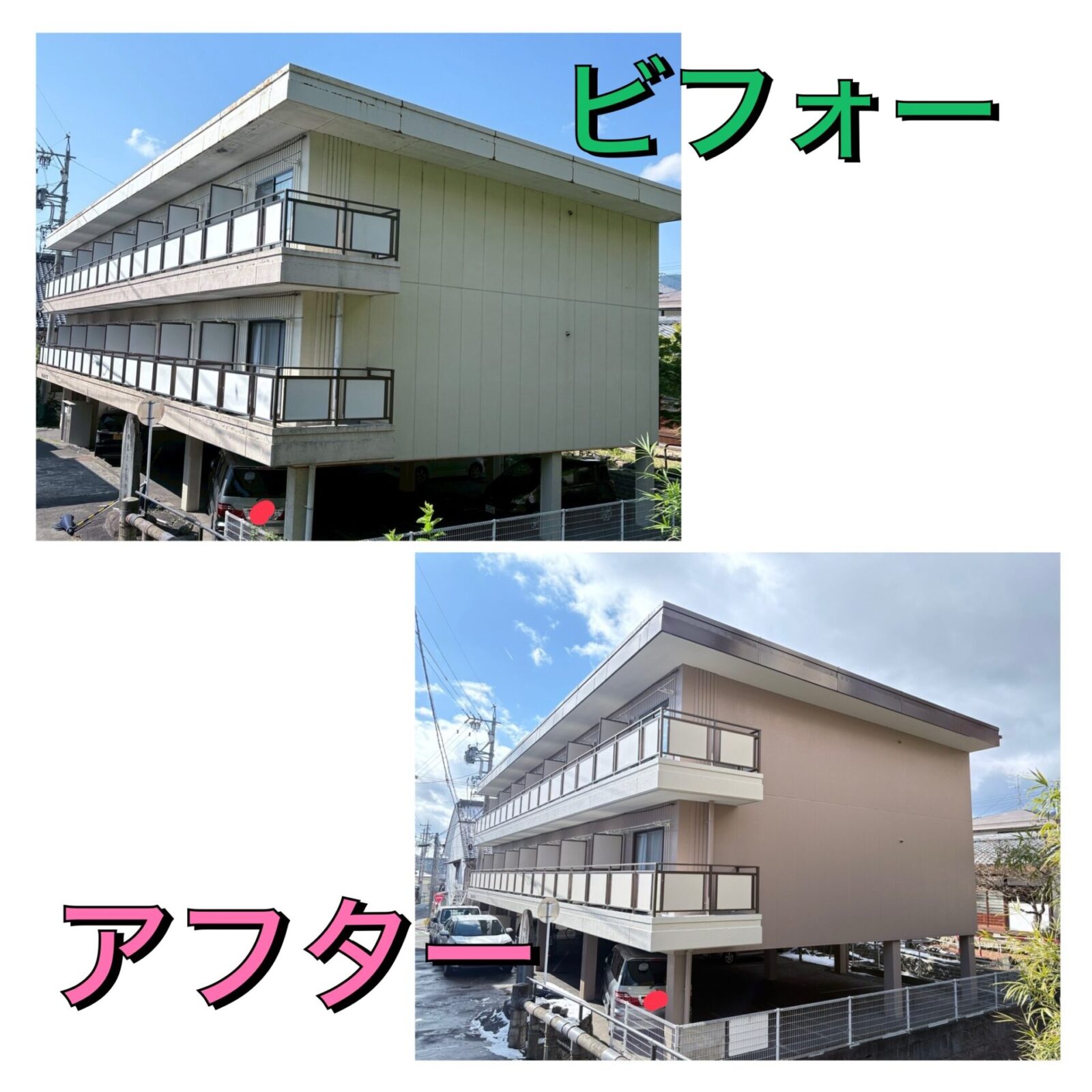善光寺付近にあるハイツ様のビフォー&アフター✨ALC外壁で築年数40年以上…。施工前、外壁のひび割れや、笠木のシール材が劣化し軒天に雨染みが多数あったり、ベランダ床のコンクリートがひび割れ雨漏りが発注していました😱良く耳にするのは、収益物件だから見た目が綺麗になれば、、。簡単な施工方法で済ませたい!とのご意見やご希望がありますが、永井塗装では収益物件だからといって簡単施工では済ませません!雨染みは原因を突き止めてから雨漏りを止め修繕し塗装。床面はしっかりと防水施工してから仕上げます。費用は他社さんに比べて高いと思われる事もありますが、工事内容がしっかりしているのです(*’▽’*)