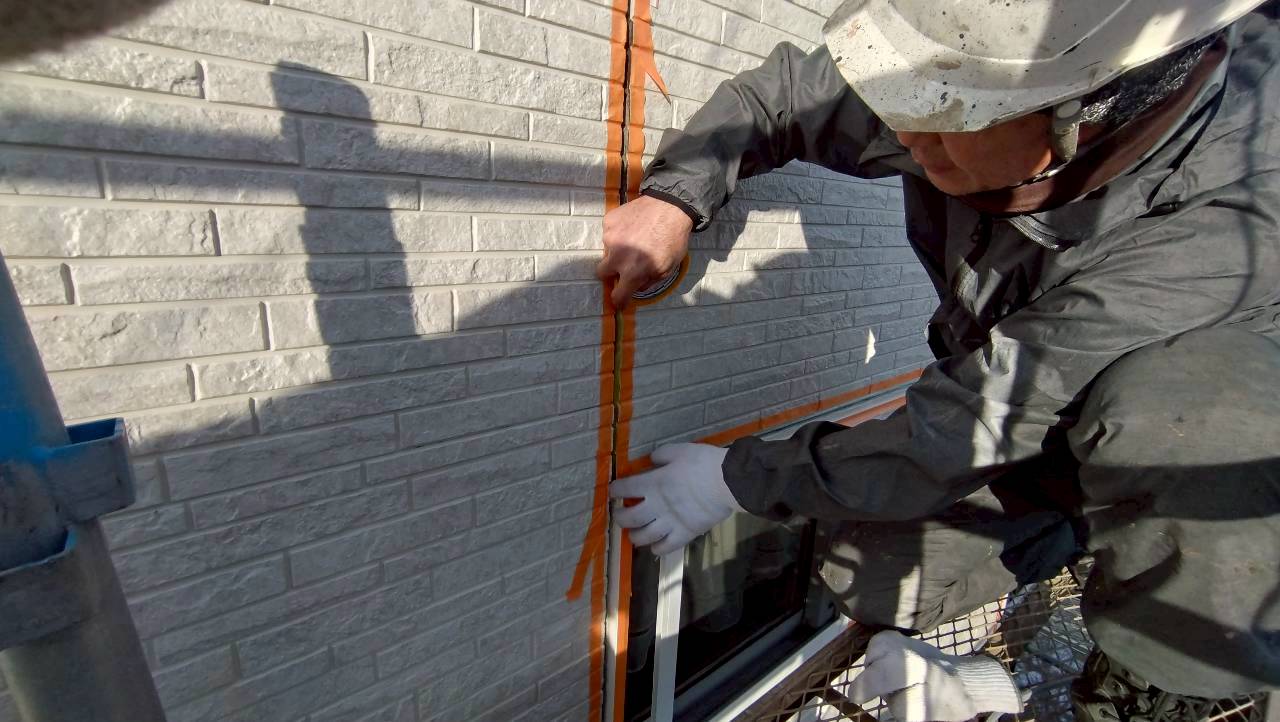 長野外壁塗装の施工中、外壁の傷んだ目地コーキングを撤去している写真とコーキングの2面接着の為、ボンドブレーカーを貼っている写真になります。新しく外壁の目地コーキング打替えするため傷んだ目地コーキングを完全に除去します。外壁材がサイディングのため目地コーキングは2面接着になります。2面接着とは外壁材のサイデイングが温度変化で膨張したり収縮したり、地震などで揺れ動く(ワーキングジョイント)ため底面を接着しないことでシーリング材が自由に動き破断・剥離しない様に柔軟に追従させる「あそび」を作るための必須工法です。傷んだコーキングを除去した目地底にボンドブレーカーを貼ることで目地コーキングが自由に動きの亀裂・破断を防ぎ長持ちさせます。 長野市外壁塗装 目地の打替え 有限会社永井塗装 施工部