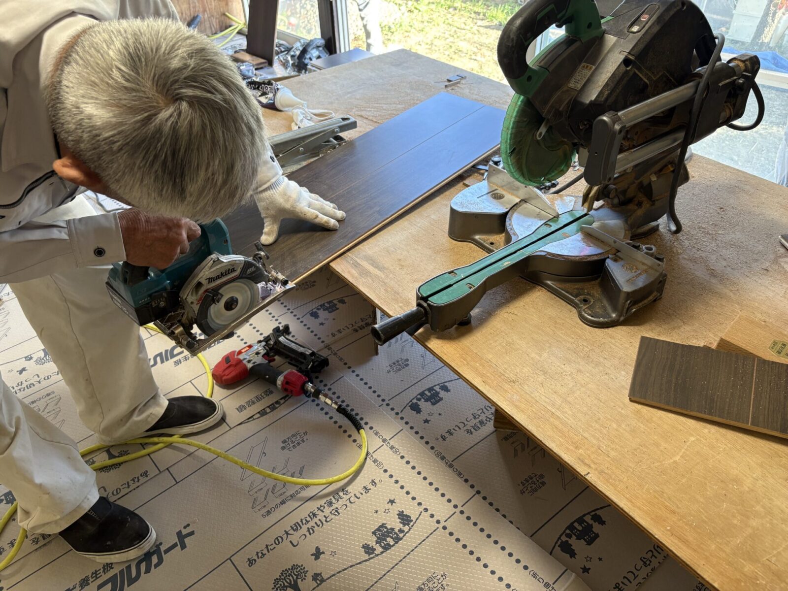 雨漏りのお問い合わせを頂き雨漏り修理・外壁塗装をする長野市のD様邸。床が、だいぶ傷んでいるため、フローリング(床)の張り替えとお部屋により、リフォーム床の重ね張りをしました。施工中の写真は大島さんが床材を加工・取付の写真です。毎日、歩くフローリングは表面コーティングが擦り減ります。使用頻度にもよりますがフローリングの耐久年数は10年~15年です。     有限会社永井塗装 施工管理部
